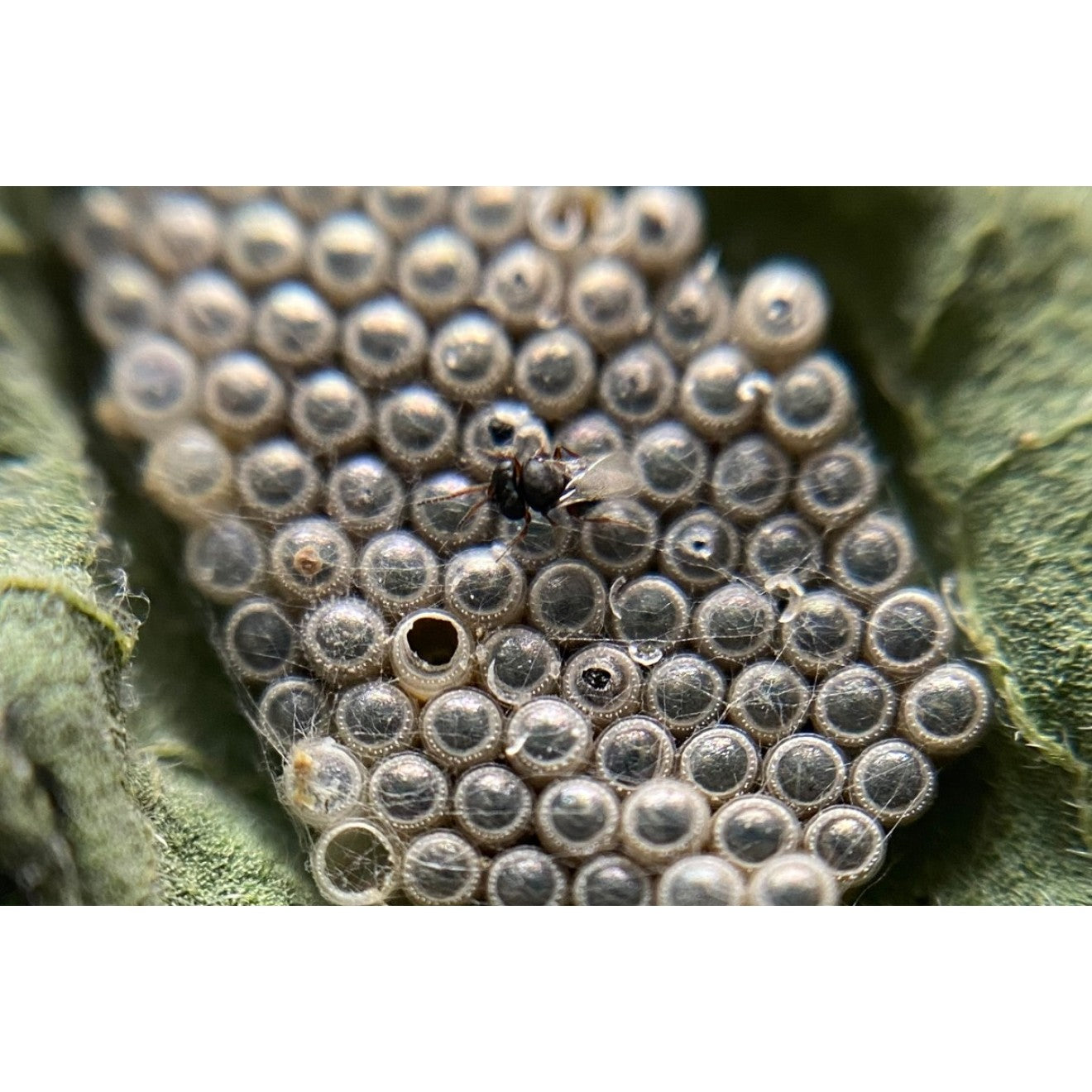 (Im Bild Eigelege der Grünen Reiswanze mit Nützling)